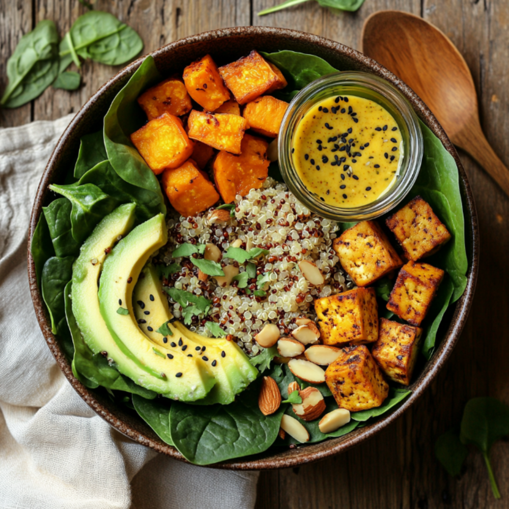 - Выложите шпинат в миску, сверху добавьте вареную киноа, замоченный миндаль, семена тыквы, авокадо, маринованный тофу и сладкий картофель.